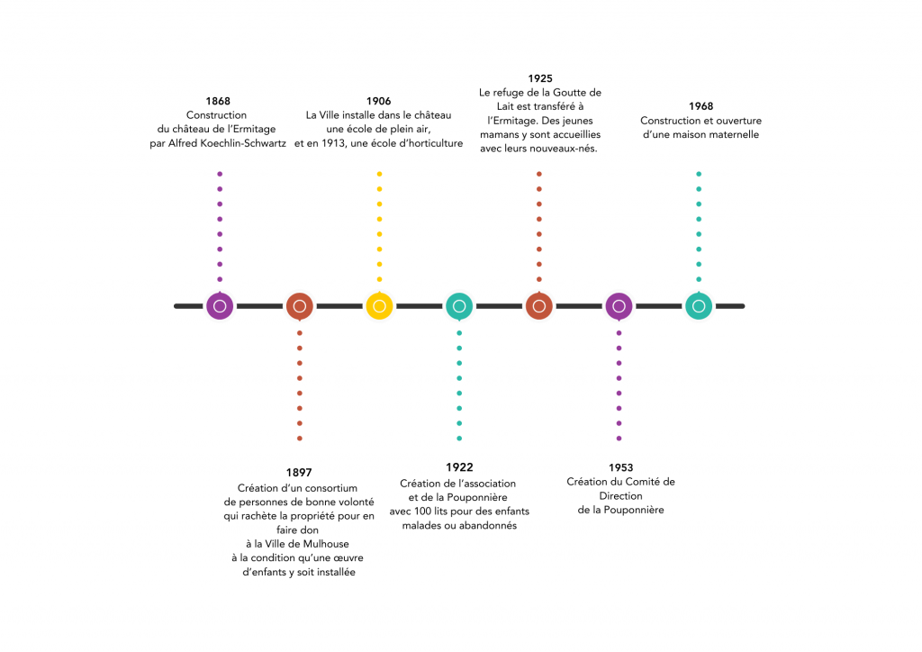 Il était une fois, une imposante demeure, située sur les hauteurs de Mulhouse appelée l’Ermitage. Elle fut construite à la demande d’un grand industriel, Alfred Koechlin-Schwartz en 1868, patron de la filature de laine peigné ENGEL et Cie. Après son départ pour Paris en 1897, un consortium de personnes de bonne volonté put racheter la propriété dans de très bonnes conditions pour en faire don à la ville, à la condition qu’une œuvre d’enfants y soit installée.
